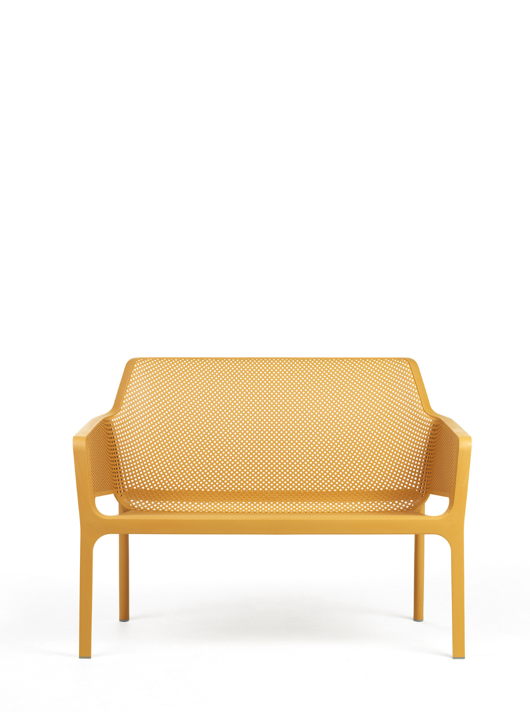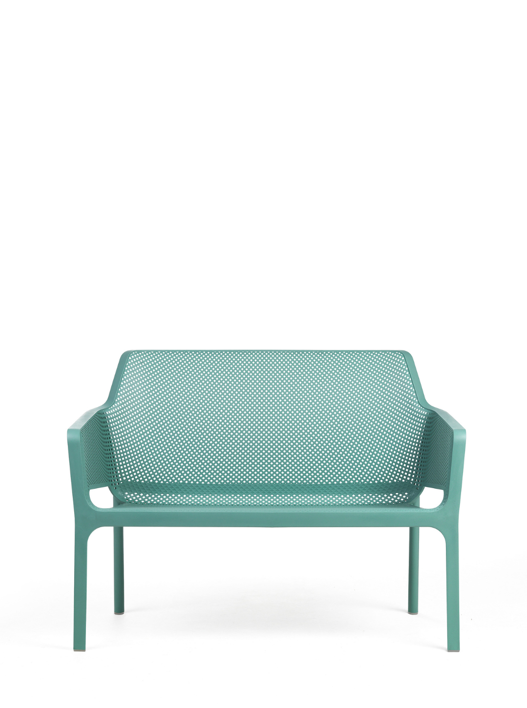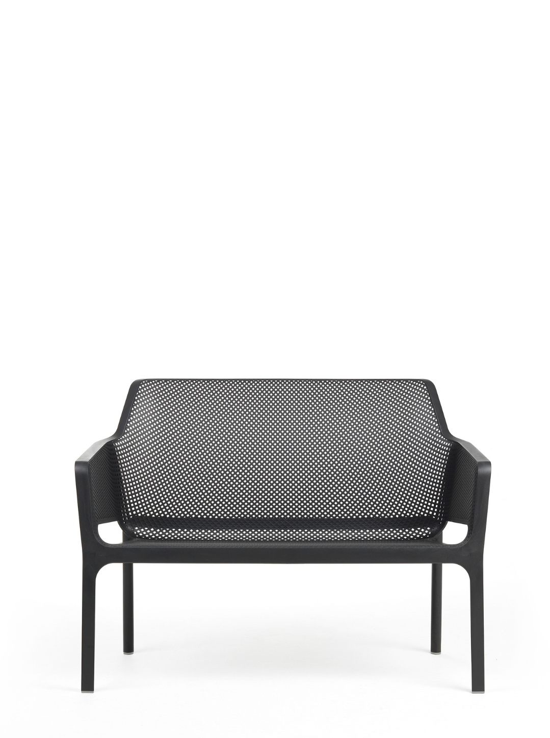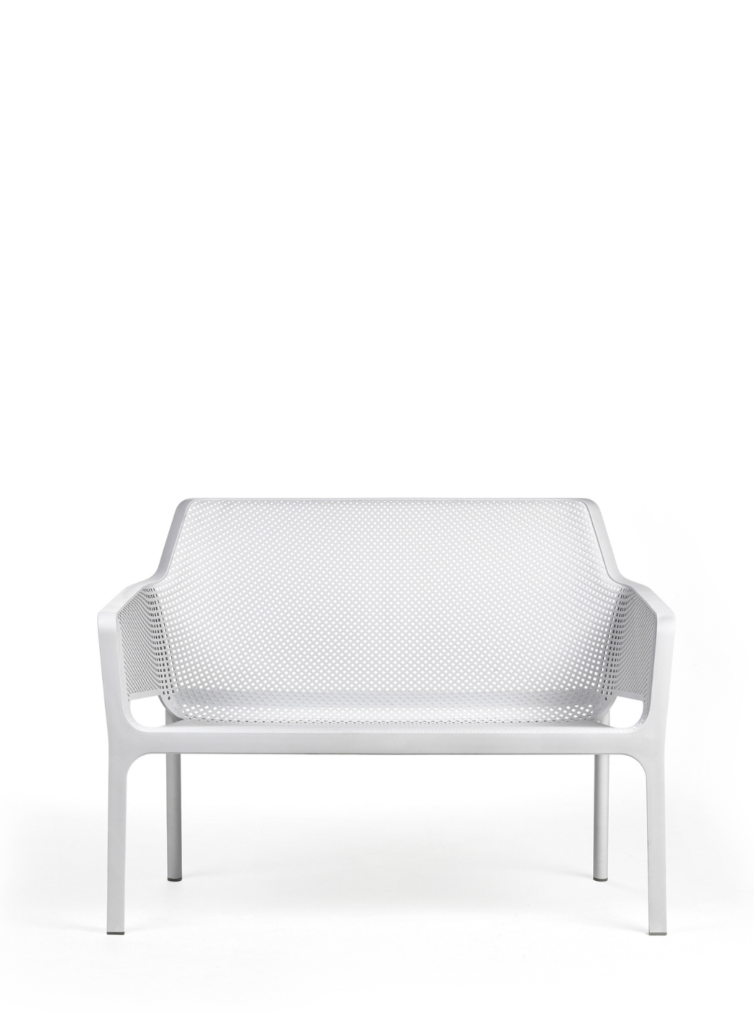 Sala premiada en varias ocasiones, de polipropileno con resina de fibra de vidrio. Decorado con un motivo de agujeros cuadrados y rayados distribuidos en la superficie tridimensional a juego las sillas, banca y mesa, el modelo Net es opaco y agradable al tacto.